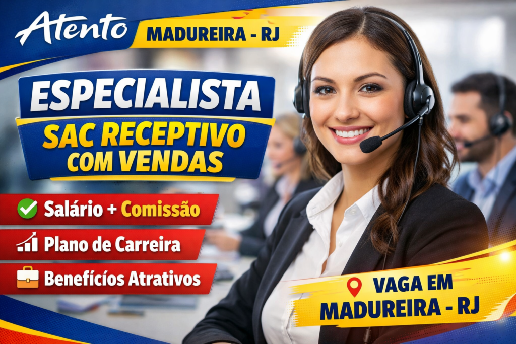 A Atento, uma das maiores empresas de Customer Experience (CX) e terceirização de serviços (BPO) no mundo, está com uma oportunidade aberta para Especialista de Atendimento SAC Receptivo com Vendas na Unidade Madureira, no Rio de Janeiro. A empresa é reconhecida por combinar tecnologia com o toque humano, promovendo um ambiente de trabalho voltado para a solução de problemas e a excelência no atendimento ao cliente. Atento